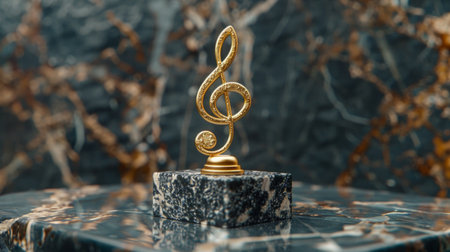 golden treble clef rests elegantly on a black marble surface, creating a striking contrast of light and shadow.