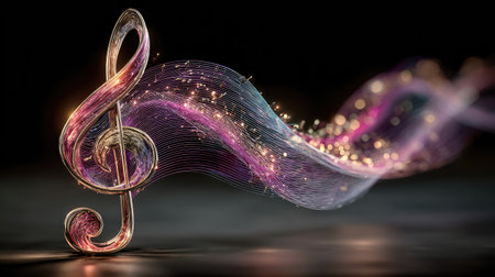 Illuminated treble clef symbol surrounded by vibrant, glowing abstract waves and sparkles on a dark gradient background. Futuristic and artistic music concept.
