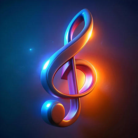 A vibrant and futuristic 3D rendering of a treble clef. glowing with a blue and orange color scheme. Perfect for music. entertainment. and technology related projects.