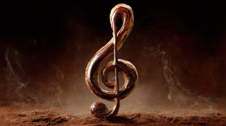 This stunning artwork features a treble clef symbol crafted in bronze, set against a dark smoky background, symbolizing musical creativity and elegance.