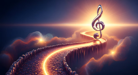 A surreal, glowing path winds through cosmic clouds towards a large, metallic treble clef illuminated by a bright light source. The image symbolizes a journey into music, creativity, inspiration, and spiritual harmony.