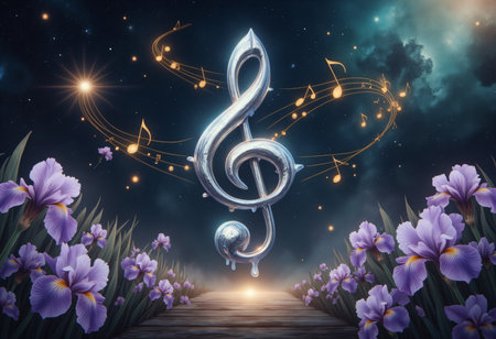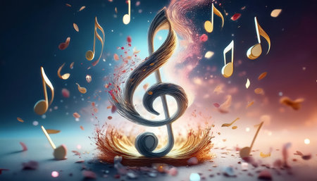 A treble clef spirals outwards amidst a cosmic swirl of glimmering stars and nebulous clouds, a visual symphony set against the dark expanse of space.. AI Generation