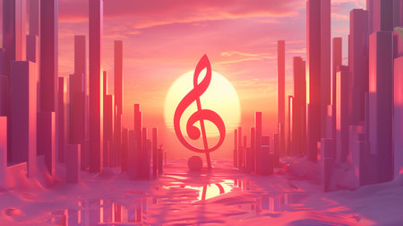 3D treble clef encircled by minimalistic sound bars, gradient sky, sunrise effect, frontal view, World Music Day,