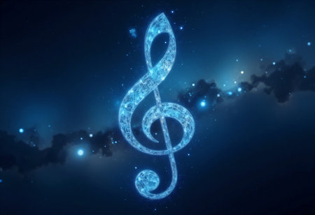 A radiant treble clef, rendered in shimmering particles, floats against a backdrop of swirling celestial nebulas. The composition features a deep blue palette with highlights of light. Its style evokes an ethereal quality, suggesting a dreamlike cosmic setting, suitable for various creative design projects.