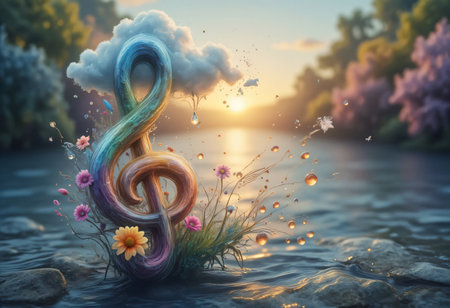 A stunning visual of musical notes gracefully floating over calm waters at dusk, creating a serene and tranquil atmosphere perfect for artistic and creative themes.