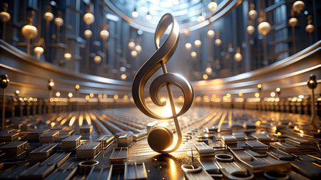 This stunning image features a golden treble clef intertwined with musical notes, showcasing a modern and elegant artistic design. Perfect for music-related projects.