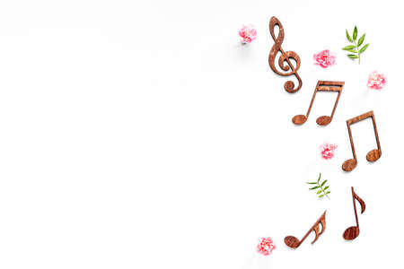 Black volumetric notes and violin key on white background top view. treble clef. Key of G