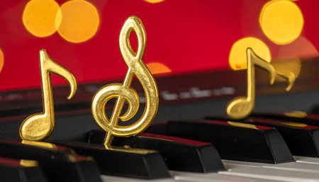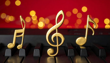 Three golden musical symbols, including a treble clef and notes, are placed on piano keys with a red background and bokeh lights.