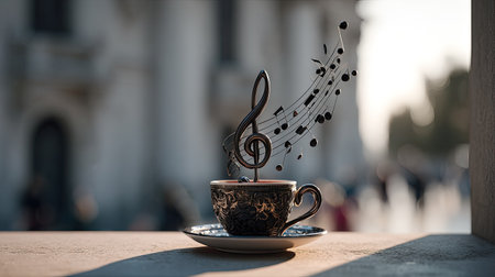 Finely detailed, dark, ornate teacup or coffee cup rests on a matching saucer on a sunlit ledge or table outdoors, featuring a metallic treble clef emerging from the liquid, from which a stylized cascade of musical notes appears to flow upwards and away, set against a softly blurred, bright background suggesting an urban square or plaza with architectural details and people in the distance.