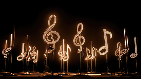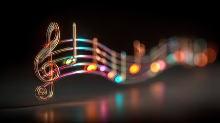 A vibrant illustration features a golden treble clef and musical notes crafted with illuminated lines. The composition showcases a flowing arrangement against a dark background, with blurred bokeh lights. This visual is suitable for creative projects, presentations, or promotional materials related to music or art.