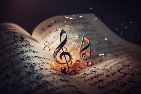 This image depicts a captivating flow of sheet music with shimmering notes and symbols, evoking the beauty and rhythm of musical expression.