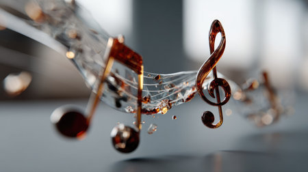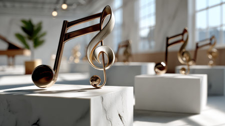 An artistic and modern arrangement of metallic music notes in an elegant interior setting, symbolizing creativity and musical expression in a serene atmosphere.