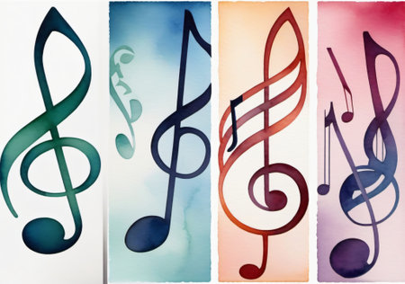 A vibrant arrangement of colorful musical notes and flowing sheet music adds a dynamic touch to any creative project, celebrating the essence of music.