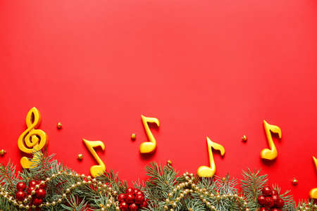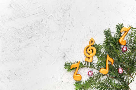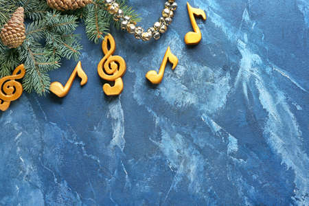 Music notes on blurred background, bokeh effect. Christmas and New Year melody