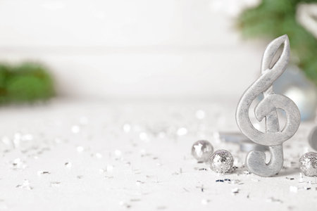 Golden treble clef, music sheets and Christmas decor on table, closeup