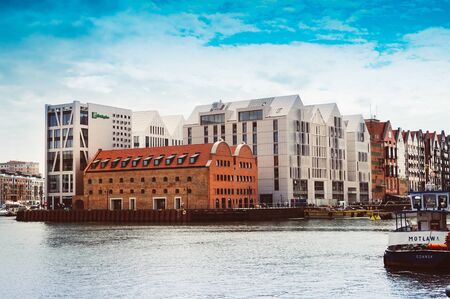Gdansk beautiful old town cityscape, view on traditional and modern architecture and Motlawa riverside view in the Gdansk city, Poland
