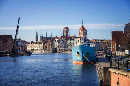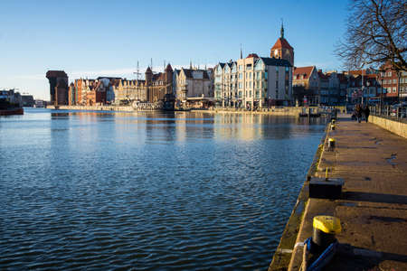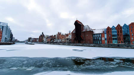 Gdansk, Poland - February 7, 2021: Old Town of Gdansk in Poland with Motlava river, Poland. Winter scenery.