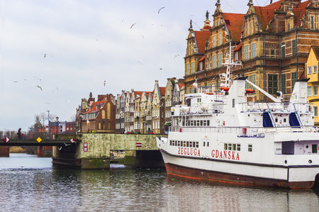 GDANSK, POLAND - JANUARY 1, 2015: View over the river with cruise ship on Motlawa river, the Old Town in Gdansk, the main seaport in Poland and is popular destination for tourists