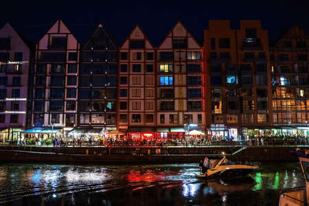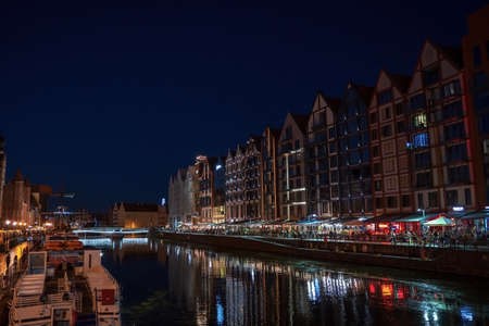 Gdansk, North Poland - August 13, 2020: Night photograph of medieval style polish architecture over motlawa river located in the old town near baltic sea