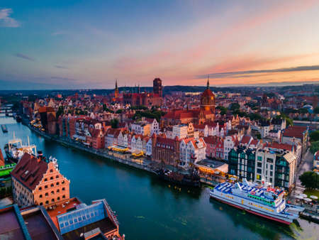 Aerial sunset view of the amazing old town of Gdansk (Poland), member of Hanseatic League with ships and yachts in the river