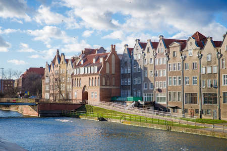 Gdansk, Poland - April 17, 2019: Colorful historic houses near Motlawa river