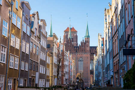 Gdansk, Poland - 30 July 2018: Old town Gdańsk, Poland with tenant houses, medieval church and modern buildings.
