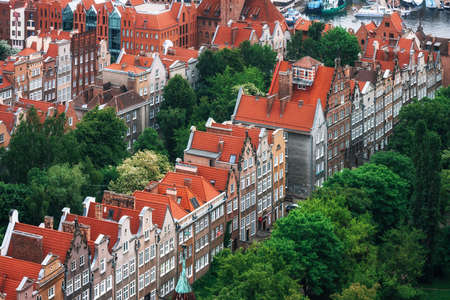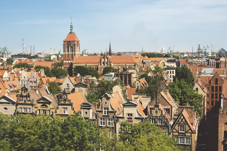 Top view of Gdansk old town with reddish tiled roofs of old town in Gdansk