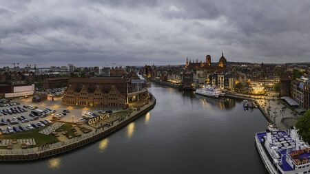 Gdansk, Poland. Aerial skyline with Motlawa river, bridges, ship, marina, Baltic Philharmonic Hall and famous monuments