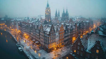 Aerial view of the historic center in Poland at night, including famous landmarks like the Gdańsk Crane and Rynek Główny (Main Market Square), bustling city lights illuminating the buildings, historic architecture visible against the dark sky, a panoramic shot capturing a wide perspective. Photography, high-resolution digital camera with long exposure for soft lighting, in the style of a professional photographer. --chaos 30 --ar 16:9 --quality 2 --stylize 500 --v 6.1 Job ID: 2ed7c937-a370-48a2-b857-c529f6d4ae0b