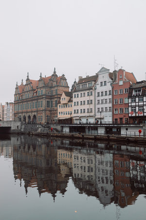 Gdansk, Poland - Mar. 09, 2022: Amazing architecture of the old town of Gdansk. Beautiful old town over Motlawa river