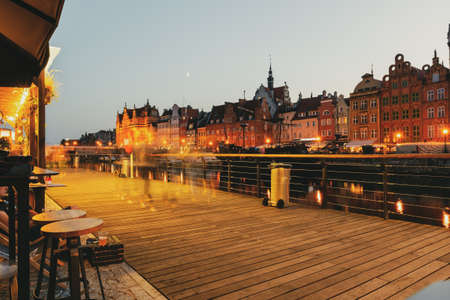 Gdansk night city riverside view, wooden embankment and street cafe on it. Facades of old medieval houses on the promenade in Gdansk city. Poland.