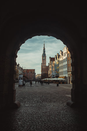 Gdansk, Poland - Feb. 22, 2022: Amazing architecture of the old town of Gdansk. Dluga Street is the main pedestrian street in the Old town center