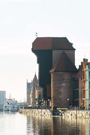 Ancient crane - zuraw Old town in Gdansk. The riverside on Granary Island reflection in Moltawa River. Visit Gdansk Poland Travel destination