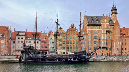 Gdansk Poland January 7, 2022. Old Town, historic buildings on the Motlawa River, the Czarna Perla ship is visible