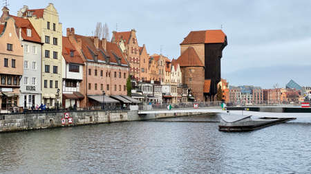 Gdansk Poland January 7, 2022. Old Town - historic buildings on the Motlawa River with a visible medieval crane