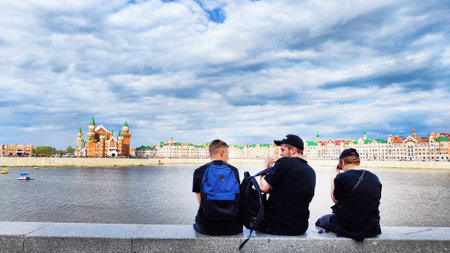 Kazan, Russia - April 29, 2023: Tourists on the waterfront of city near a river or lake on a summer, autumn, or spring day with cloudy sky and clouds. The city of Yoshkar-Ola in Russia