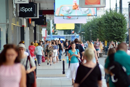 Warsaw, Poland. 1 August 2018. Crowds of people shopping at street vendors along the sidewalks of Marszalkowska Street.