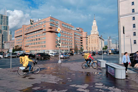 Moscow, Russia, September 30, 2020. Pizza delivery guy rides his bike in the city center.