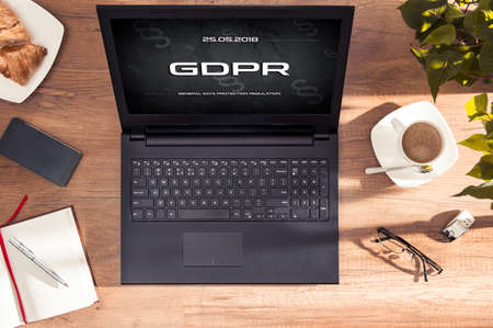 Laptop display with GDPR sign. Conception of General Data Protection Regulation in EU law. Interface created in graphic program