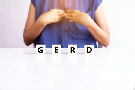 Woman having a reflux acid with the word gerd on wood block,Gastroesophageal reflux disease