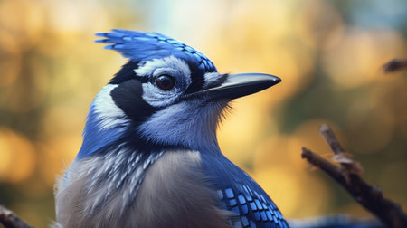 A closeup shot of a blue jay perched on a branch on blurred background