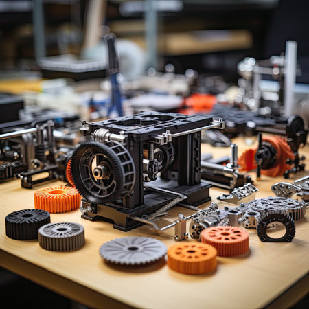 Machinery concept. Set of various mechanical devices and parts on a table at workshop. AI generated