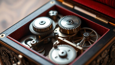 A detailed macro shot reveals the inner workings of an antique music box. The image focuses on the pinned metal cylinder and the steel comb that plucks the tines to create a melody, surrounded by intricate gears. This represents nostalgia, mechanical music, precision engineering, and classic craftsmanship.