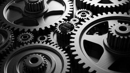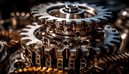 Metallic machinery interlocked in teamwork, turning with precision and strength generated by artificial intelligence
