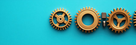 Golden gears align beside a microprocessor on a bright turquoise surface, highlighting the intersection of technology and mechanics.