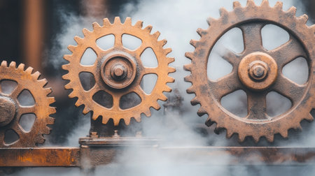 A striking close-up of vintage rusty gears in an industrial environment, surrounded by steam and smoke. This image showcases the intricate details of machinery, emphasizing the beauty of engineering and craftsmanship in a timeless setting.