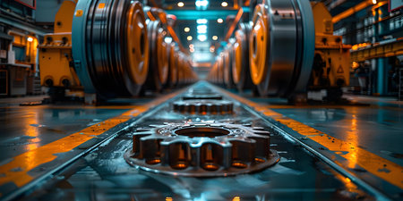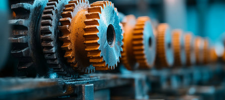 Detailed close-up image of industrial gears and machinery in an active manufacturing facility, highlighting the precision engineering and advanced technology used in production.