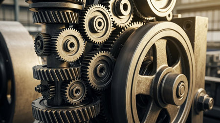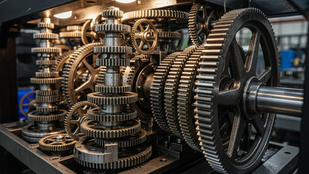 Intricate gears and machinery in an industrial setting highlighting modern engineering design