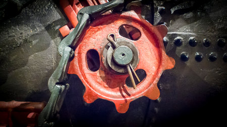 Large cog wheels with control wheel, part of cog mechanical close-up.