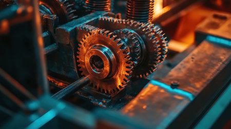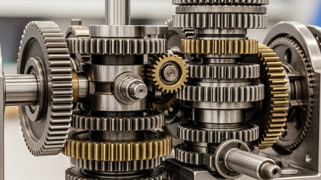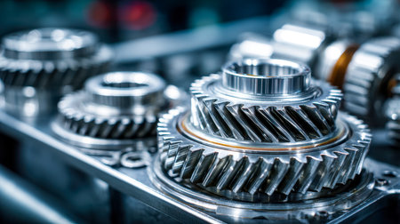 This detailed image showcases a close-up view of industrial gears, emphasizing precision engineering and metallic texture in a modern machine environment.